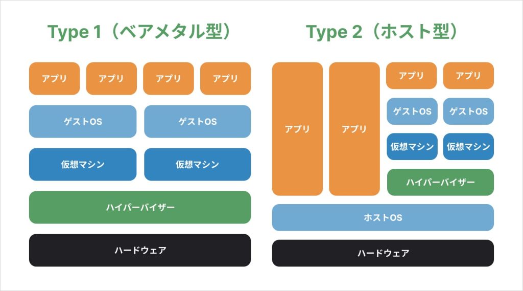 ハイパーバイザーは、実装方式によって2種類に分類されます。