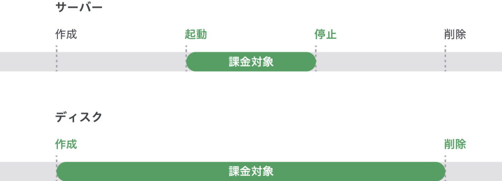 したがって、サーバーが停止中・削除されたあとであっても、作成されたディスクは削除されない限り課金の対象となります。