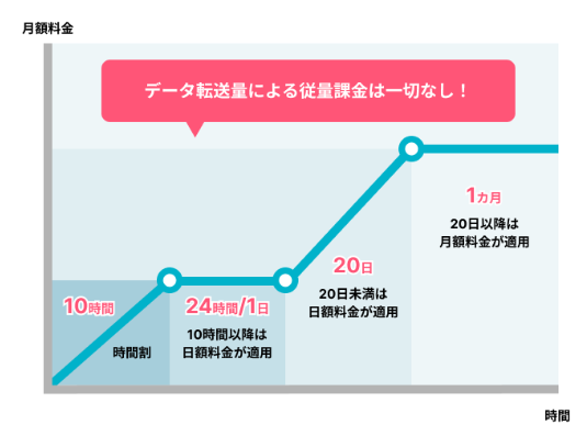 前出の図は、利用時間に応じた料金体系の変化を示しており、1か月の稼働時間が10時間以内であれば時間料金、それ以降は20日までが日額料金、それ以降は月額料金に自動で切り替わります。
