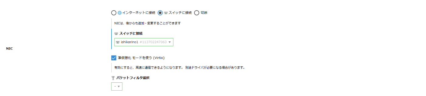新たなゾーンのネットワークには、まだスイッチしか存在しません。ここに接続するサーバを1台起動します。右メニューの「サーバ」でリソースを作成する際に、接続先のネットワークとして先ほど作成したスイッチ「ishikarino1」を選択します。