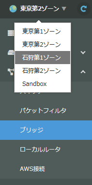 最初に既存の環境でブリッジを作成しますが、ゾーンをまたいで同一プロジェクト内でアクセスされることに注意してください。それでは作業を進めます。クラウドのコンロールパネルのメニューから「ブリッジ」を選択します。