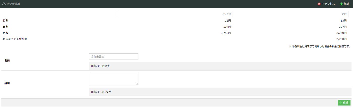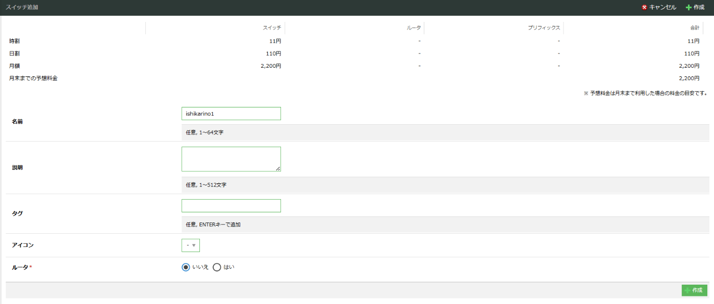 右上の「+作成」をクリックして「スイッチ追加」画面を開きます。