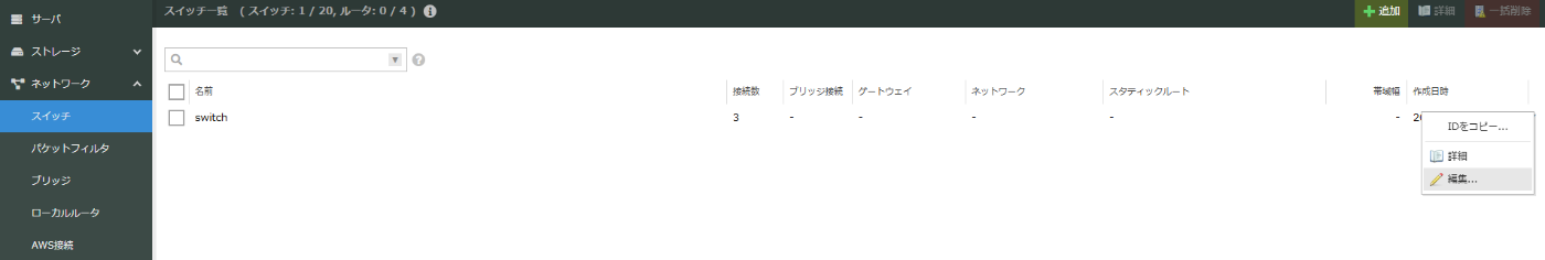 続いて既存のネットワークで起動しているスイッチを、ブリッジに接続します。左メニューの「スイッチ」を開き、既存のスイッチ「switch」を「編集」します。