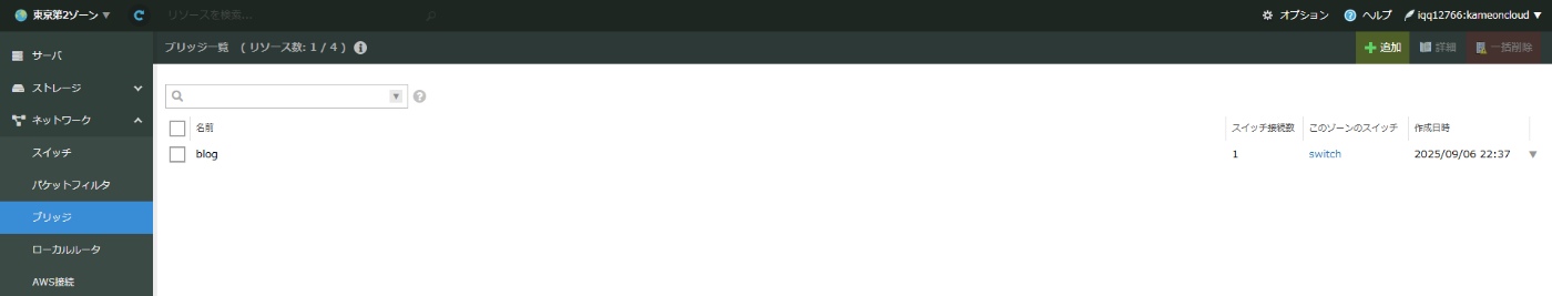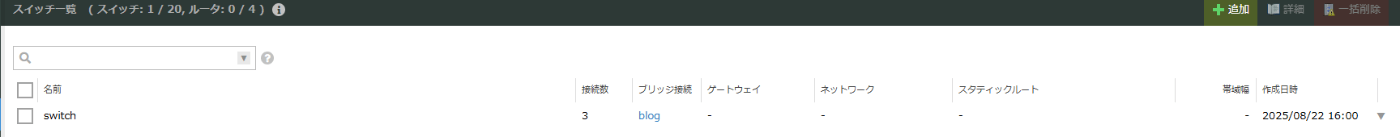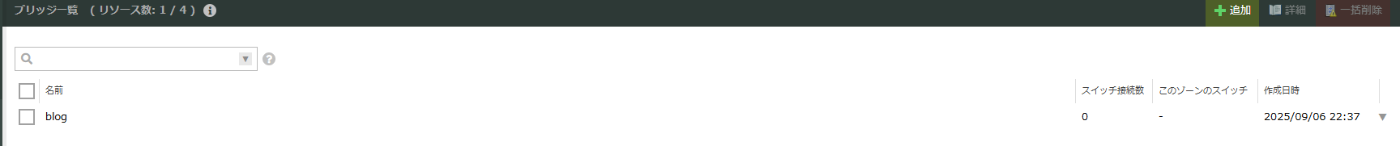 右メニューから「ブリッジ」を選択すると先ほど作成したブリッジ「blog」が表示されており、既存のネットワークで接続したためスイッチ接続数は「1」ですが、このゾーンのスイッチは空欄になっているはずです。